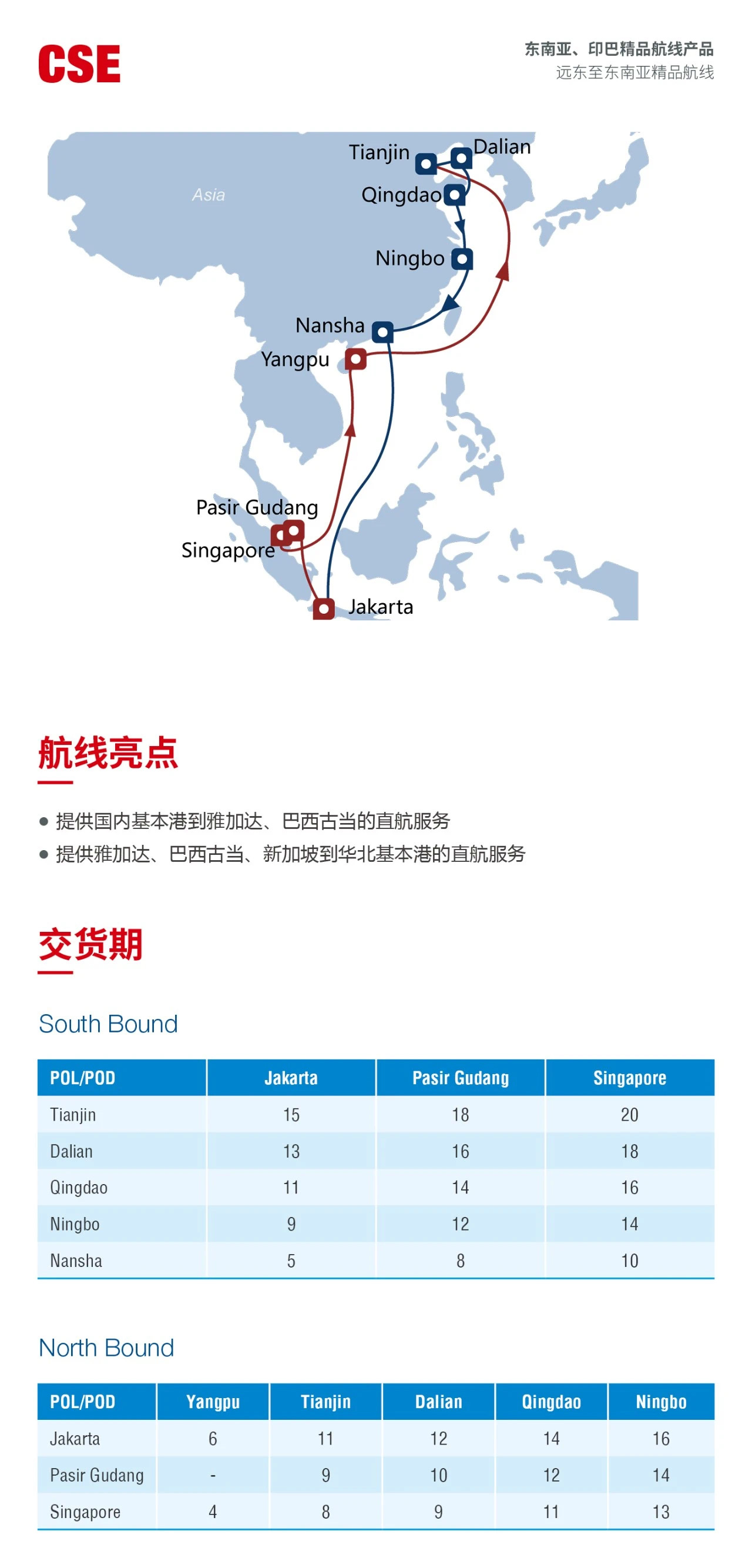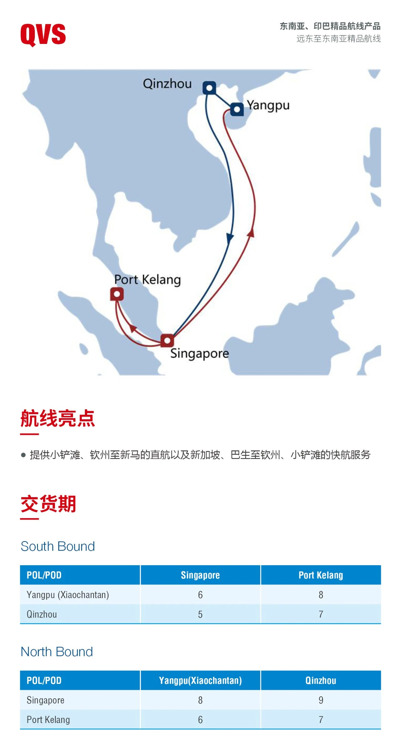 远东至东南亚直达航线服务产品,11组远东至南亚直达航线服务产品,另有36组东南亚、南亚区域内支线。丰富的服务网络可全面覆盖远东市场基本港口和东南亚、南亚主要国家港口,为每一位客户提供有竞争力的快速、便捷、直航运输服务,并支持内陆点延伸服务。